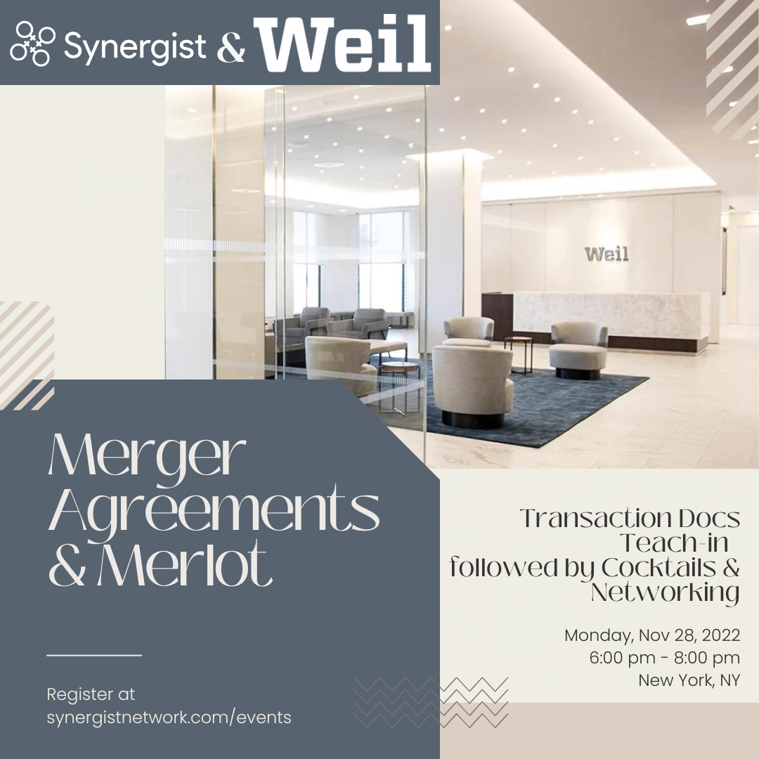 Join Synergist and Weil for a teach-in focusing on the negotiation of key issues in acquisition agreements. The presentation will also cover an overview of the acquisition process and timeline, as well as important reminders for protecting the firm. The training will last for an hour with cocktails and appetizers to follow.