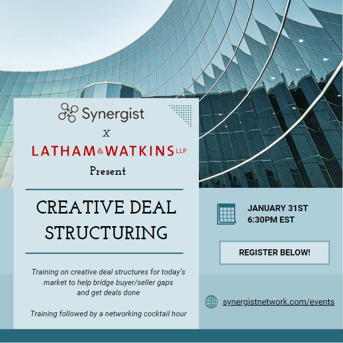 Join Synergist NY for an engaging and informative discussion on creative deal structures in today's market with Latham & Watkins, followed by a networking cocktail hour.